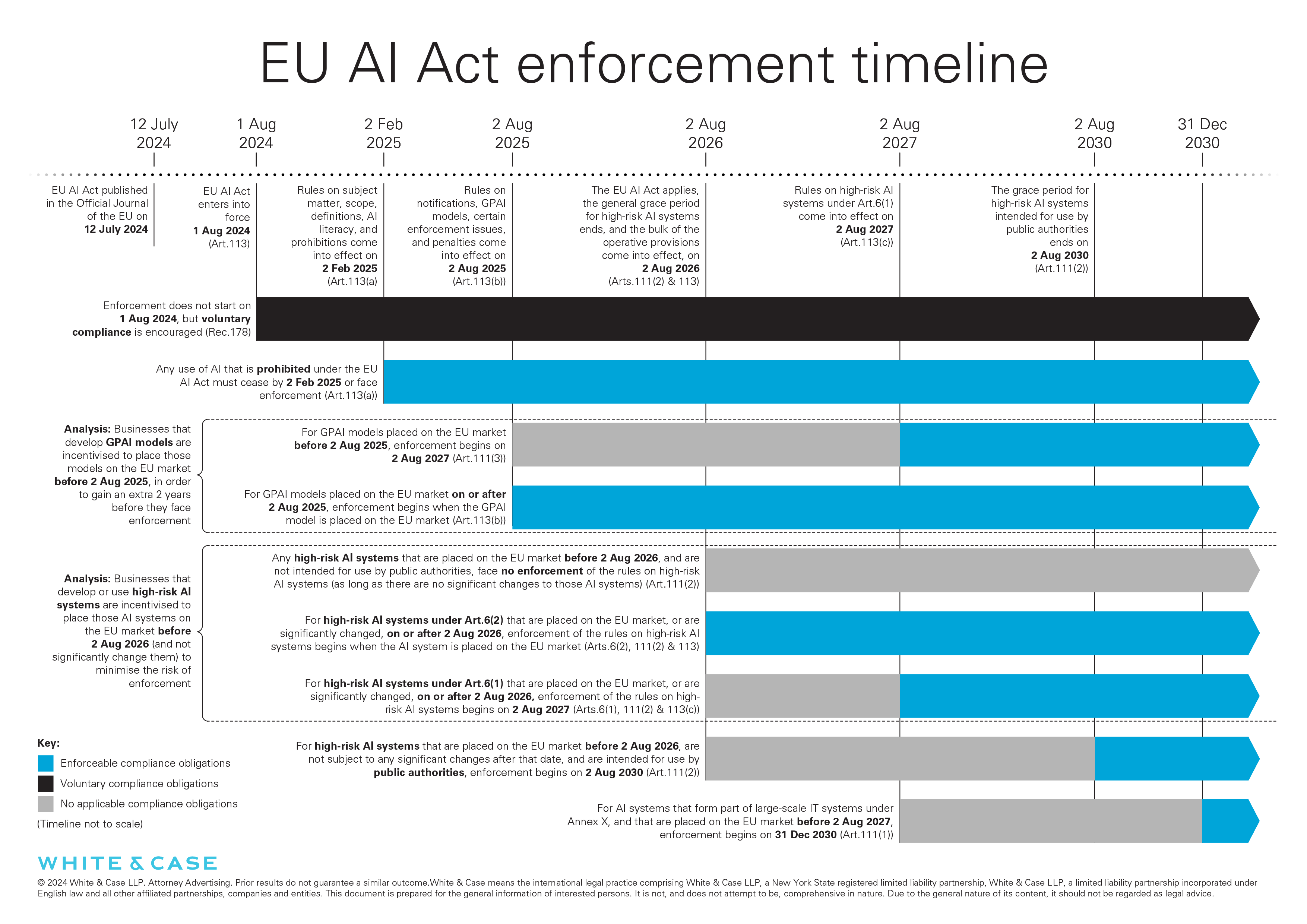 - The AI Act was published in the Official Journal of the EU on 12 July 2024. The deadlines for compliance, which all flow from 1 August 2024, come into force over the course of three years.