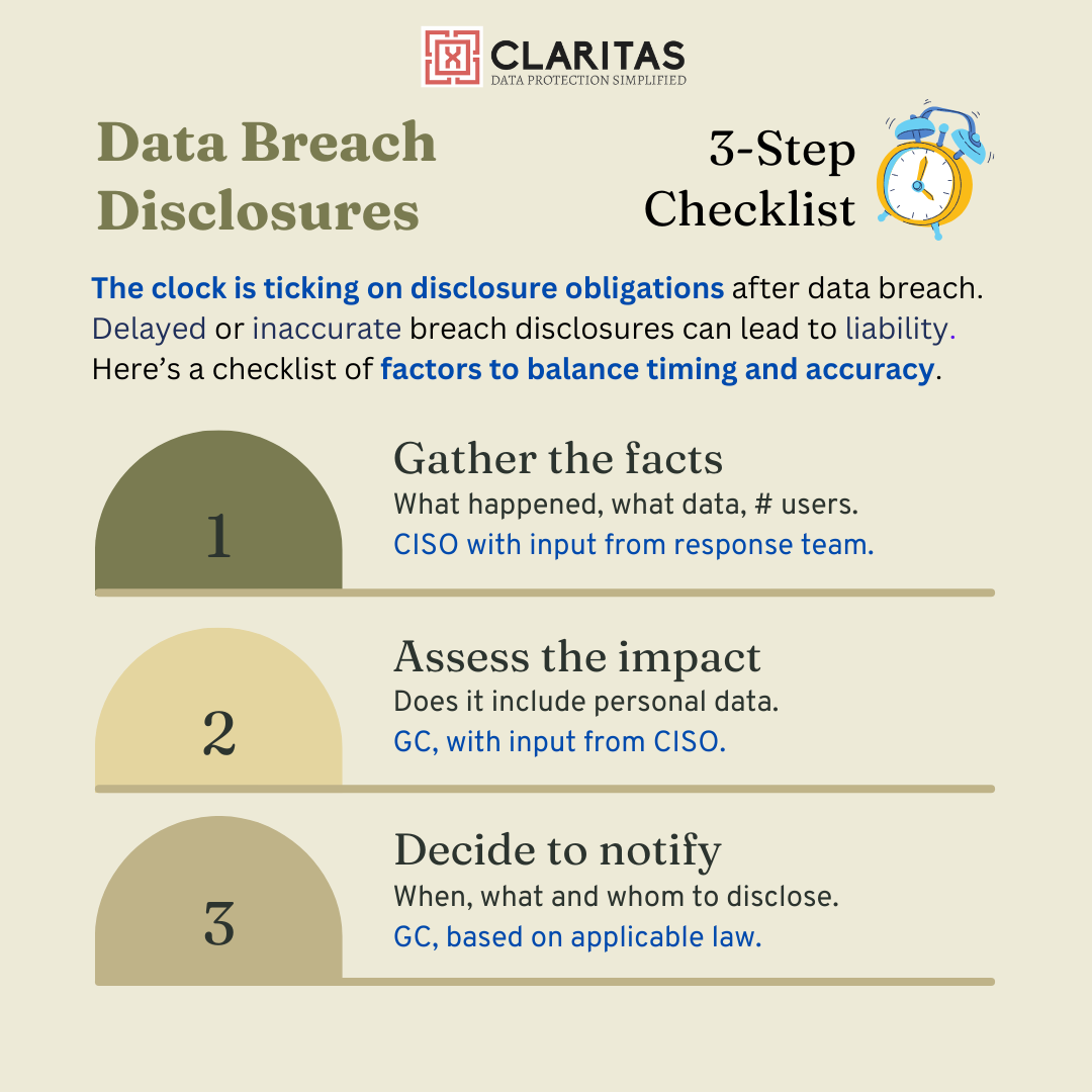 Responding to a data breach is understandably a stressful time. Speed is of essence as the clock is ticking on notification obligations to customers. For public companies, clocks may be also be ticking to meet the SEC 4-day disclosure rule. A company may be held liable if the disclosure is delayed for too long, but also if it is deemed as inaccurate or misleading.