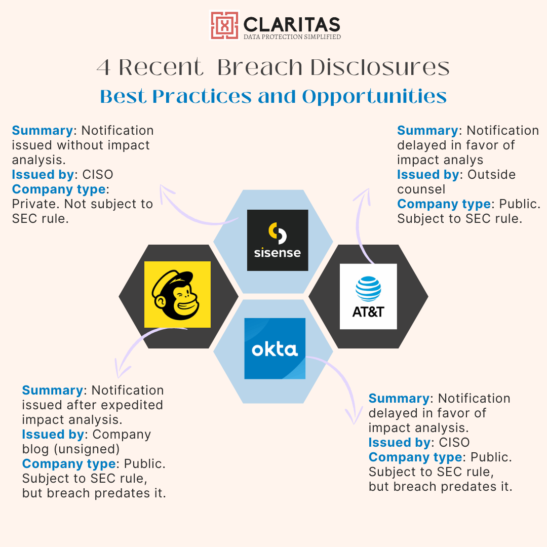 Whats common between Sisense, ATT, Okta and Mailchimp? They all recently issued breach “disclosures.” However, the timing of the disclosures ranged from 24 hours to 3 years, and the content from "abundance of caution" with unspecified details to a detailed root cause analysis with a specific timeline.